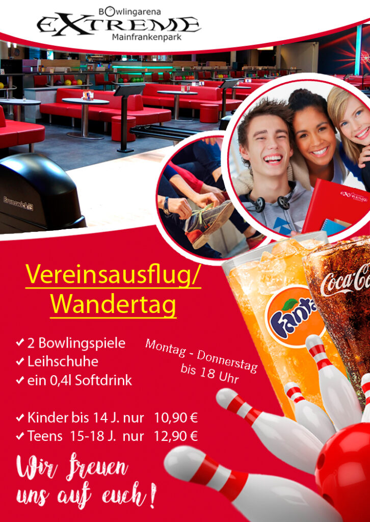Die coolste Art den „Wandertag“ zu verbringen. Wir öffnen die Bowlingarena nach Vereinbarung bereits am Vormittag. Gleich anrufen oder Email schreiben und den gewünschten Termin für Euch sichern.