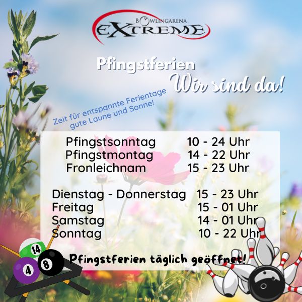 Daher ist an beiden Tagen von 9:00 bis 18:00 Uhr leider kein Bowling möglich. Billard könnt ihr aber ganz normal spielen. 😊